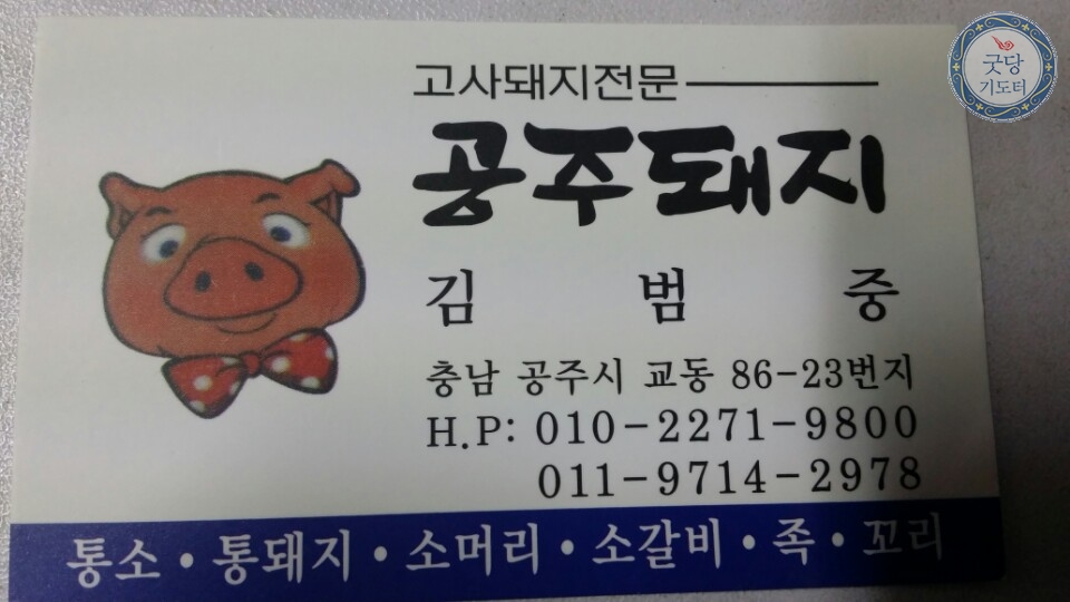 공주돼지 아리톡 0 11658 2015.05.19 12:14 충남 지역 통소, 통돼지, 소머리, 소갈비, 족, 꼬리 정보 주소 휴대폰 010-2271-9800 일반전화 -- 분야 축산 앱에서 보기 공주돼지, 용한점집찾기, 굿뉴스, 굿당기도터